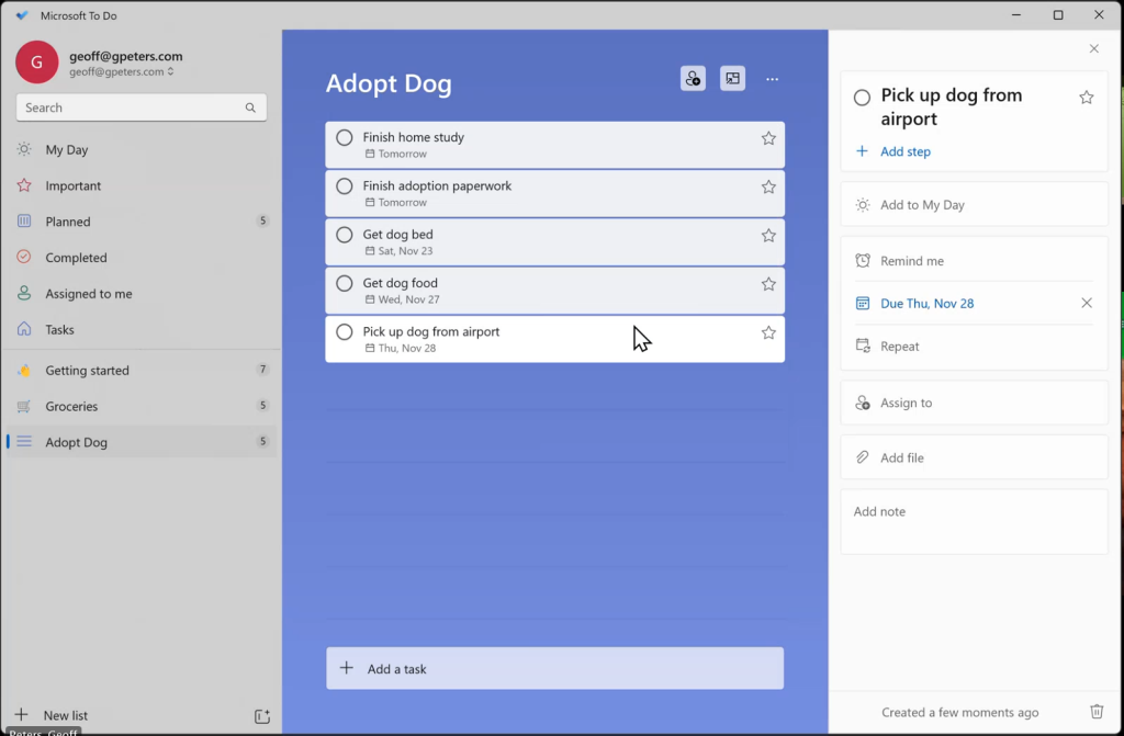 Let me walk you through a real example. When we adopted our dog from Thailand, here’s how I managed the project in Microsoft To-Do:
