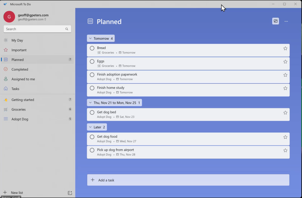Now these tasks appear both in my “Adopt Dog” project list AND in my daily views based on their dates. On tomorrow’s list, I’ll see the home study and paperwork alongside tasks from my “Groceries” project and any work projects—giving me a complete picture of my day.